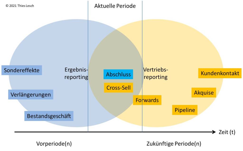 Immer wieder stellen sich Fragen rund um die Struktur des Reportings für den Vertrieb. Oftmals wird vom Vertriebsreporting gesprochen, weil der Berichtsempfänger der Vertrieb (als Organisationseinheit) ist – nicht weil dort über den aktuellen Vertriebserfolg oder die Vertriebsleistung berichtet wird. Meistens begnügt man sich mit einem Ergebnis-/ Erfolgsreporting, weil es typischerweise leichter in die GuV überzuleiten ist – und damit leichter zu erklären ist. Allerdings findet der Vertrieb meistens zeitlich vor der GuV statt. Ich versuche dies einmal nachfolgend zu veranschaulichen: