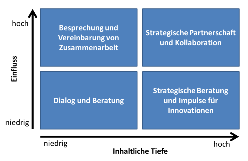 Es gibt (inspiriert von Spitzek und Hansen, 2010) grundsätzlich vier Ausgestaltungsmöglichkeiten für eine Stakeholdereinbindung durch Beiräte, abgeschichtet in den Dimensionen Einfluß (hoch/niedrig) und Einbindungstiefe (hoch/niedrig).