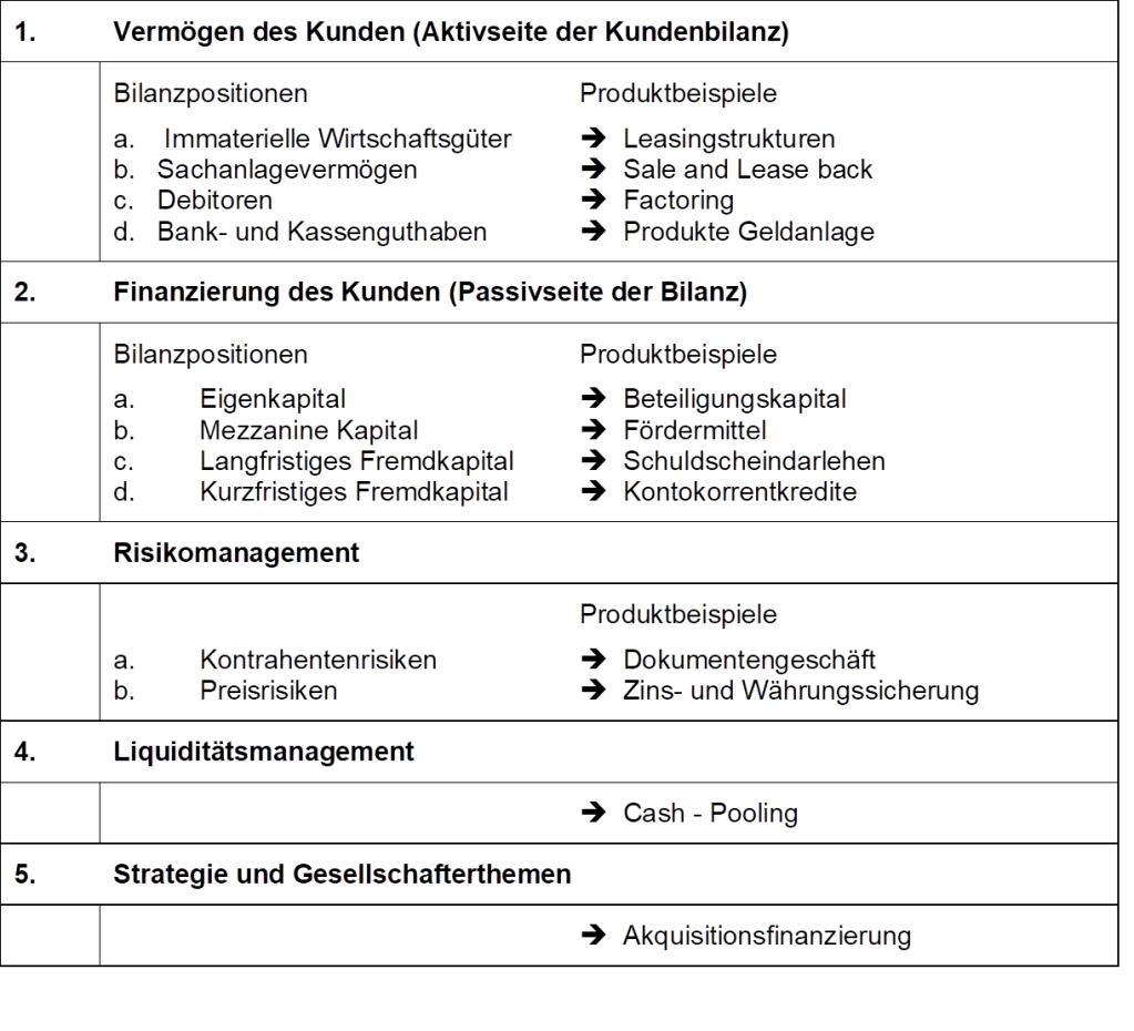 So könnte sich eine Kategorisierung der Bedarfsfelder am betrieblichen Leistungsprozess des Kunden orientieren oder -noch besser – an die ohnehin für die Bonitätsprüfung der Marktfolge genutzten Beurteilungskriterien.