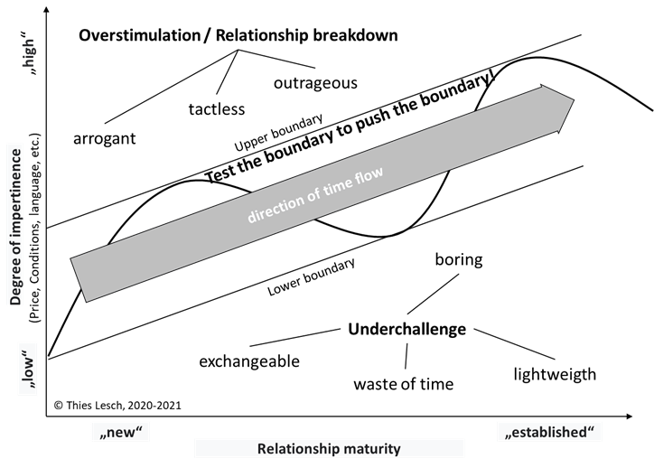 If I leave the acceptance channel downwards, then I am a pure waste of time and not helpful for the business partner. If I am in the upper half of the acceptance channel, then the other person has to accept one or two unreasonable demands, but in a dose that they can tolerate and their interest in continuing the interaction outweighs them. Depending on the context, this imposition can be part of a negotiation of terms and conditions or simply an openness (“impertinence”?) In communication that this person is otherwise not used to or that is perhaps unusual for the respective context.