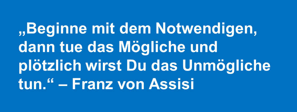 Und dann wird das Mögliche in Angriff genommen. Ja, und ehe man sich versieht, wird auch das Unmögliche vollbracht. Das ist nicht in einer biblischen Kategorie von Wundern gemeint, sondern es wird das vollbracht, was eingangs für unmöglich gehalten wurde, weil es aus der Ferne sah viel, viel größer aussah, als es jetzt aus der Nähe tatsächlich ist.